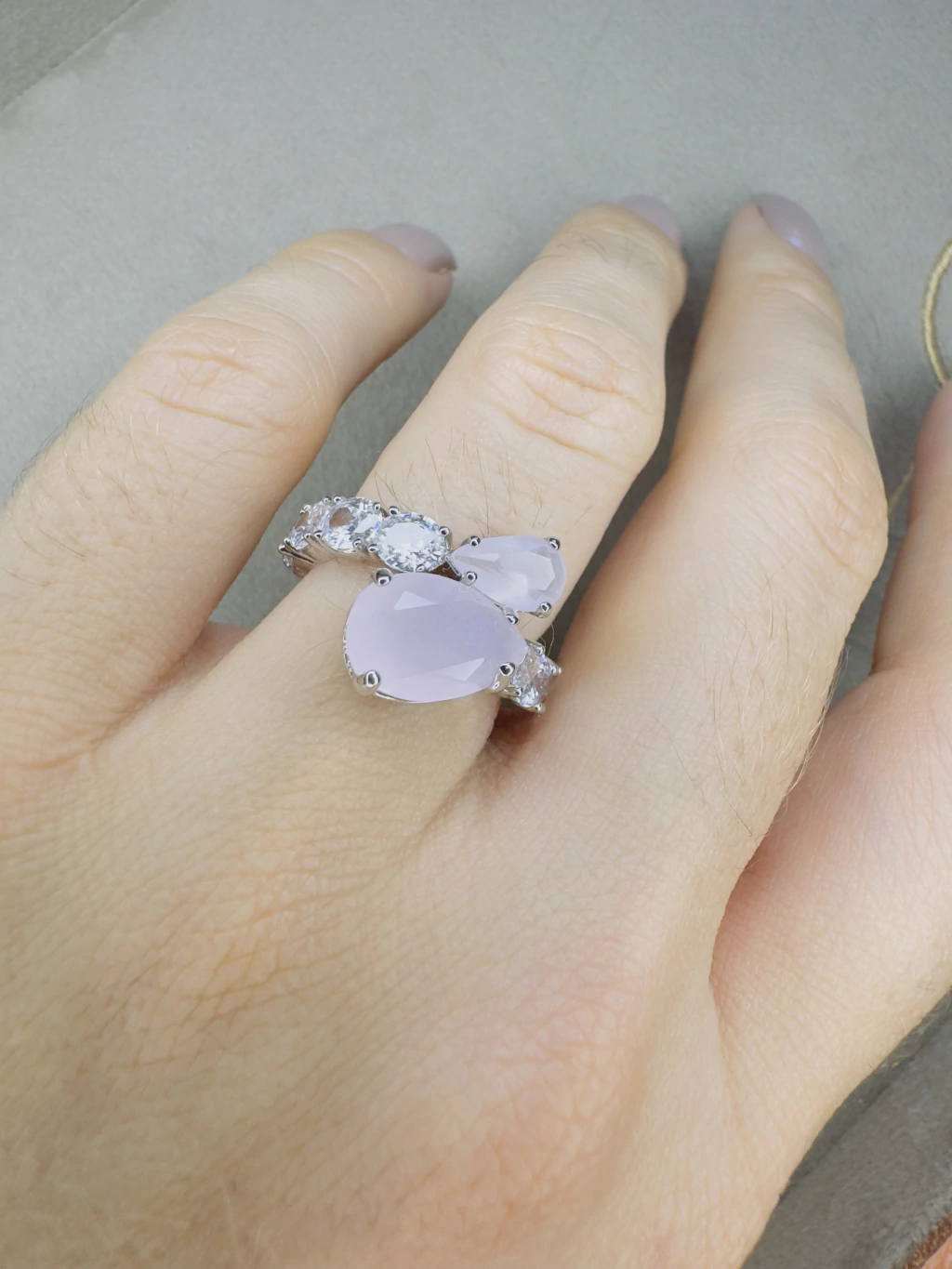 Anel na Semijoia com banho de ródio branco, cravejado com zircônia cristal e 2 gotas em zirconias rosas.