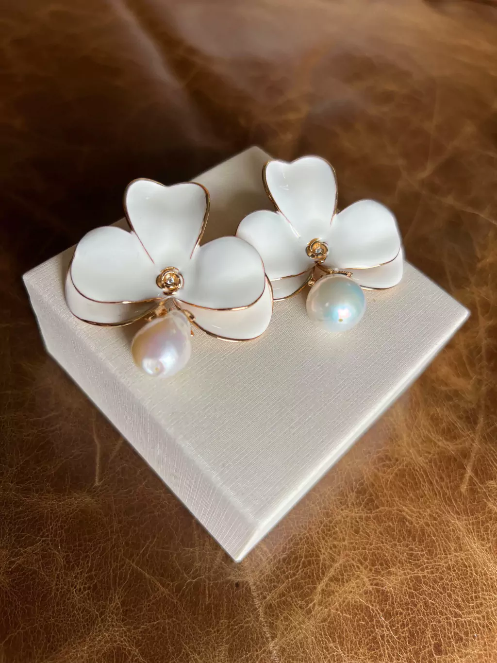 Brinco Orquídea esmaltada lisa com pérola barroca