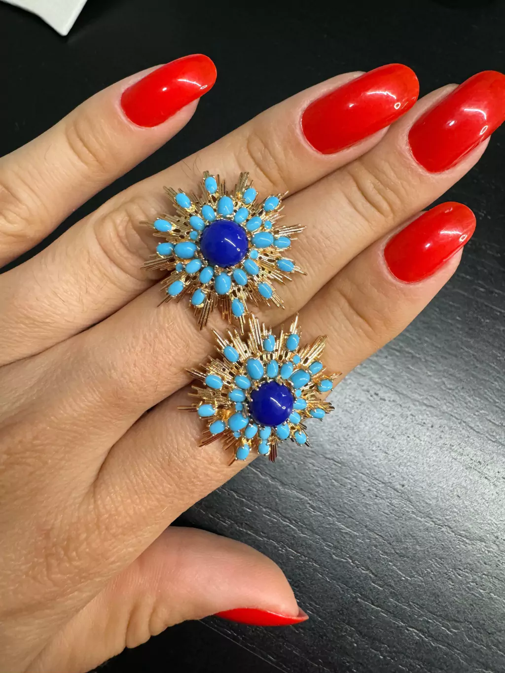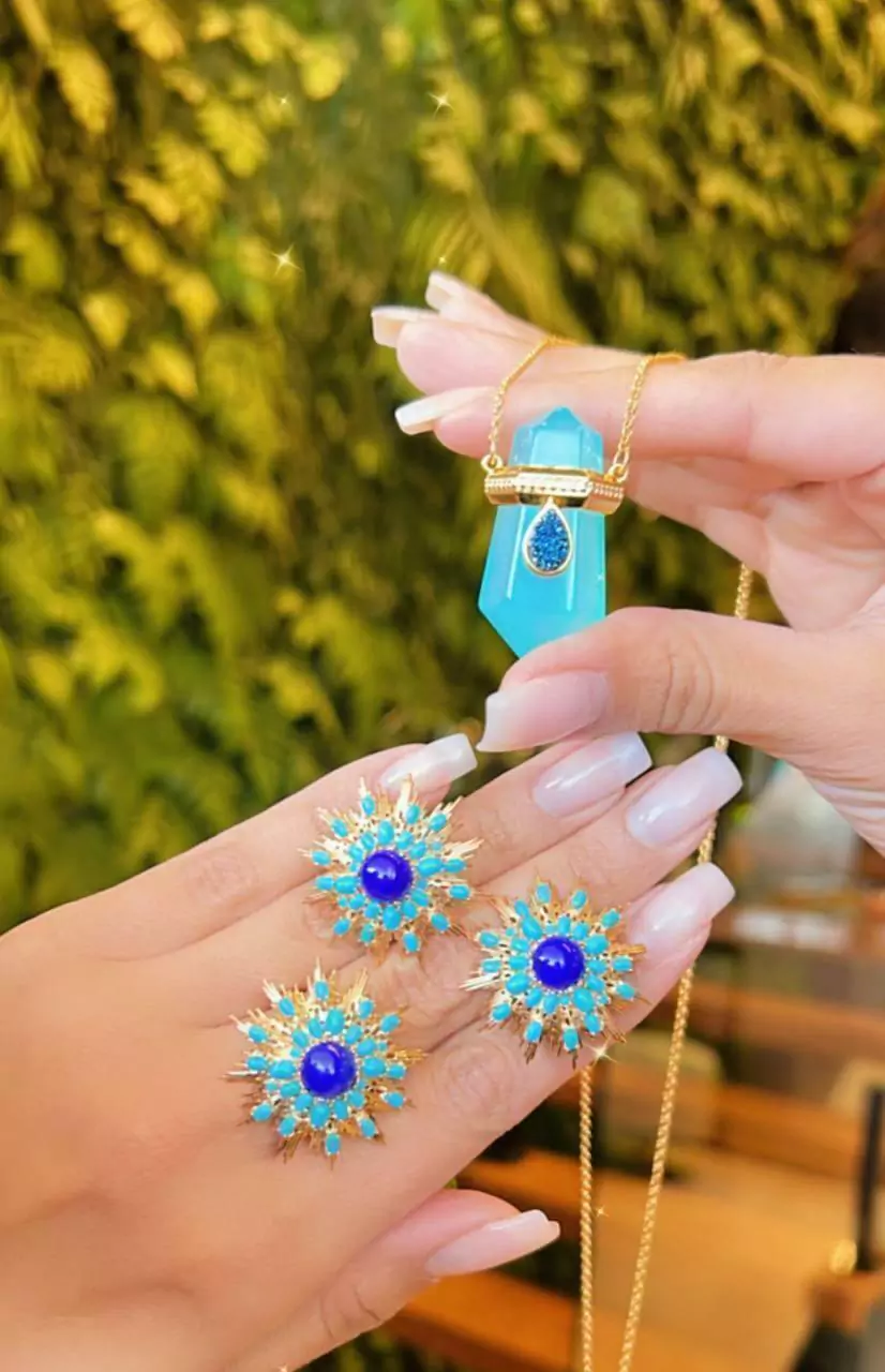 Brinco com pedra turquesa no azul claro e escuro com banho de ouro 18k.